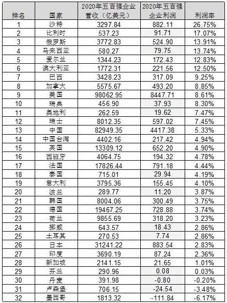 沙特排世界第一,该国就只有一家阿美石油入选了五百强,因此其实就是阿美石油的利润率,竟然高达26.75%,2019年全球石油市场并不景气,不少500强里面的石油企业都是处于亏损状态,但是阿美石油依然能赚不少,可见沙特石油开采成本之低。