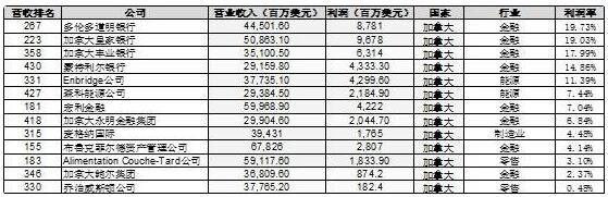 而俄罗斯,马来西亚,澳大利亚,巴西,加拿大五个国家都是靠能源矿产+金融两大支柱造就了高利润率,这个就不一一列举了,就放一个加拿大的五百强公司的排名,可以看出13家加拿大的五百强公司里面利润率排前八位的都是金融和能源公司,就只有一家制造业企业。