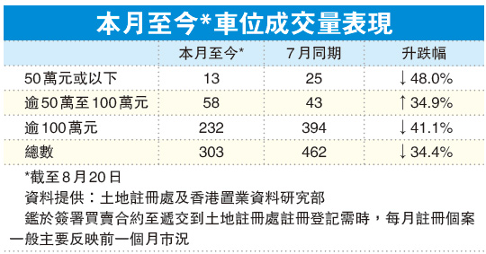 香港置業行政總裁李志成引述土地註冊處資料表示,由本月初至截至上周四(20日)止,香港共錄得303宗純車位註冊,較7月同期的462宗,急跌34.4%。香港置業表示,鑑於由簽署買賣合約到遞交到土地註冊處註冊登記需時,8月註冊個案主要是反映7月市況。