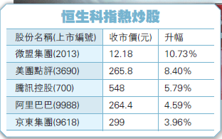 科技股指數重磅股24日普遍上升,美團(3690)先跌後急升8%收市,京東(9618)股價首度升穿300元,連同阿里巴巴(9988)升約4%,三隻股份齊創新高。其他藍籌股大致造好,港交所(388)走高1.2%,滙控(005)升0.7%。