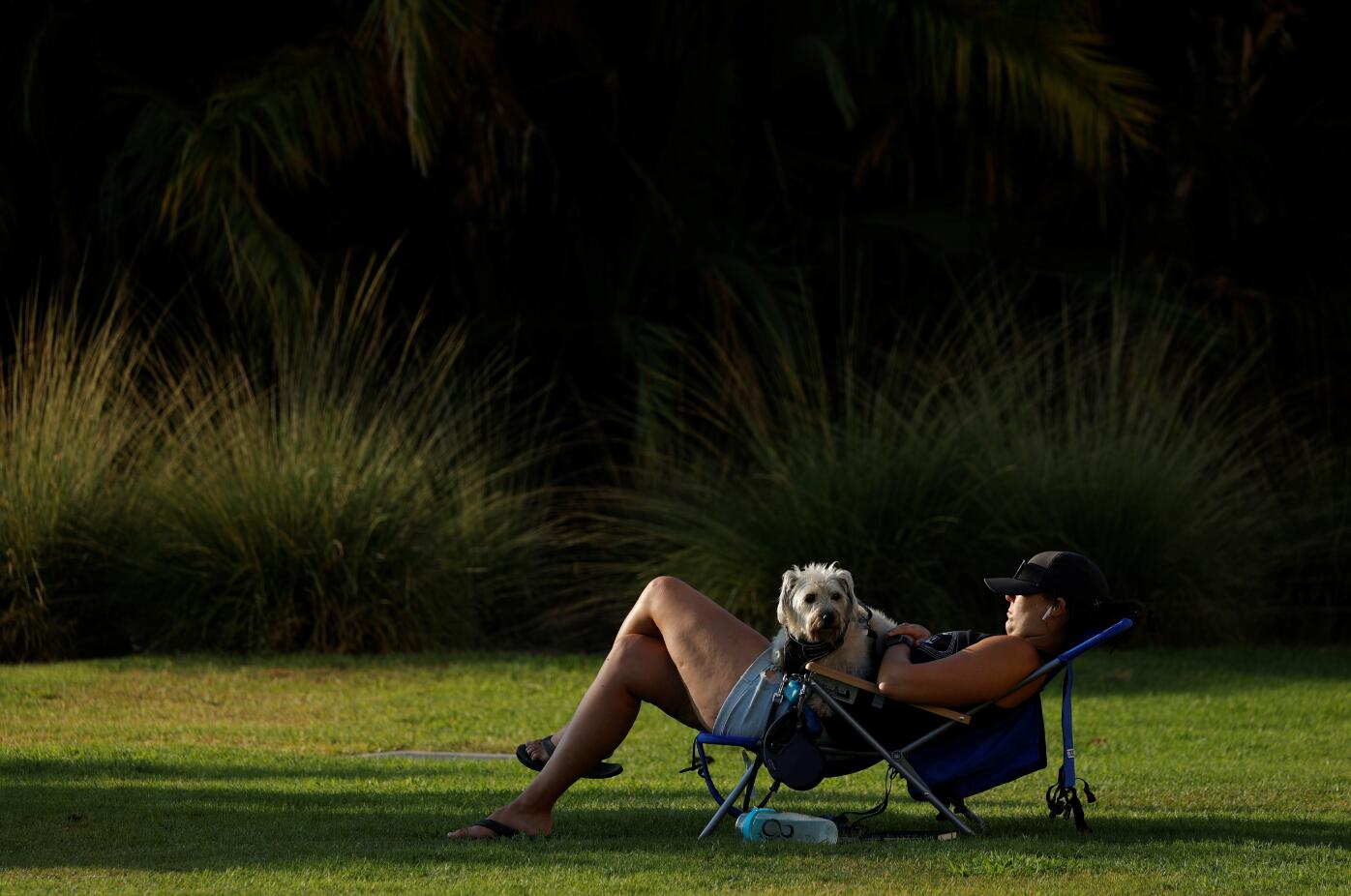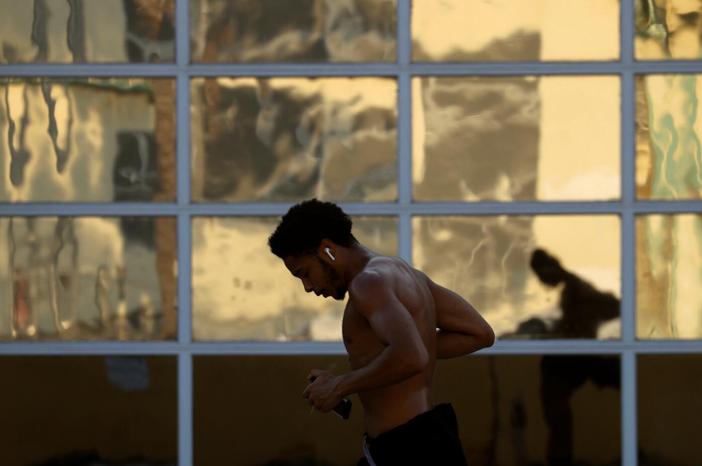 冠状病毒(COVID-19)爆发期间,美国加州圣迭戈的人们采取各种方式来度过疫情中的日子,当地时间8月24日,在位于市中心公园的户外瑜伽课堂,学员进入前先测体温;一名男子戴着口罩沿着河边散步;一位妇女携爱犬在草地上闭目养神;一位慢跑者沿着河边跑步时的影像反射在建筑物的玻璃窗上;一架联邦快递的货运飞机即将着陆。 (图源:路透社)