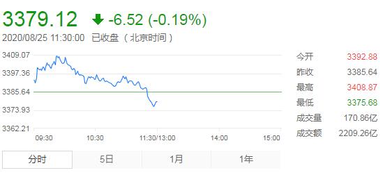 8月25日,星期二,农历七月初七(七夕)。今日A股三大指数小幅高开,开盘后,指数快速冲高,上证指数上午10点左右,摸高道3408点,随后快速回落。创业板指数高开后,维持强势。截至上午收盘,沪指报3379.12点,跌0.19%;深成指报13688.23点,涨0.16%;创指报2710.11点,涨0.95%。盘面上,白酒、注册制次新股、无线充电板块居涨幅榜前列,农业种植、国防军工、代糖概念表现较差,整体大盘涨多跌少,首批创业板注册制新股吸金明显。