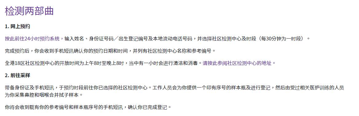 年滿六歲、無病徵的市民可以凭姓名、身份證號碼及手機號碼預約,再在時段內到指定社區檢測中心採集樣本,陰性檢測者大約3天會接到短訊通知,陽性者將收到衞生署電話通知。