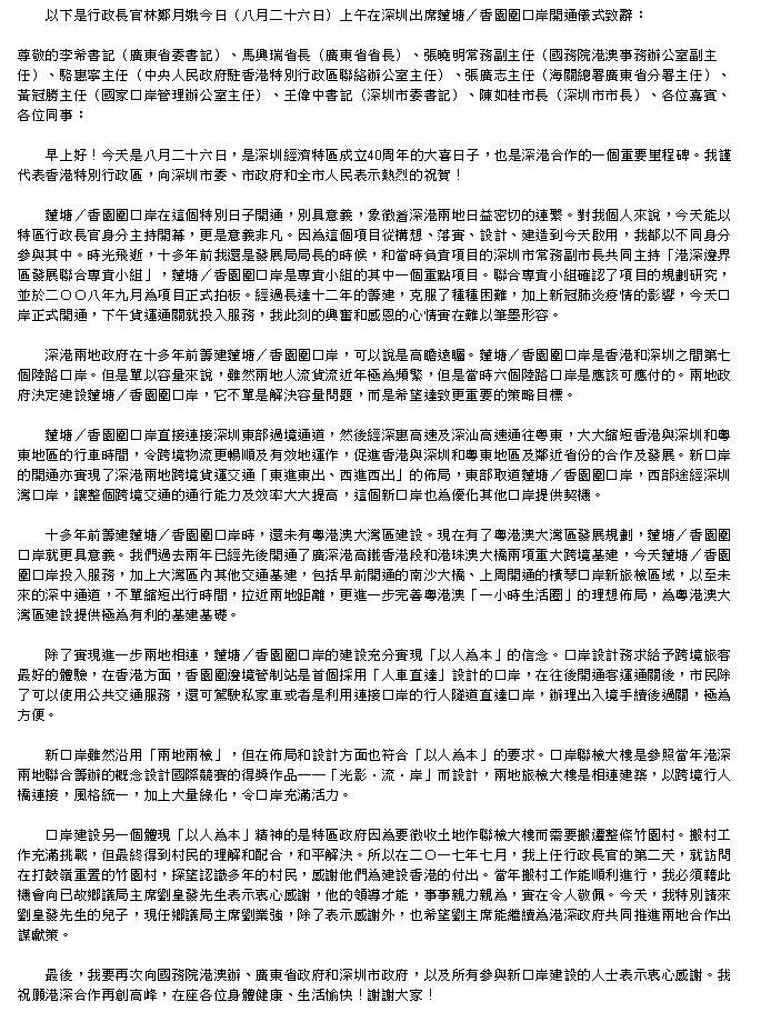 她在讲话中表示,蓮塘/香園圍口岸的開通大大縮短香港與深圳和粵東地區的行車時間,令跨境物流更暢順及有效地運作,亦為粵港澳大灣區建設提供極為有利的基建基礎。