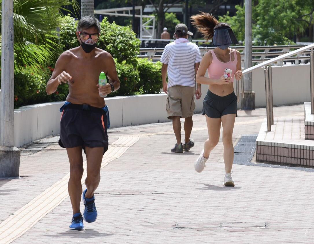 在持續疫情下, 市民繼續帶口罩跑步做運動以保健康, 期待著本周五政府放寬戶外運動的「口罩令」。(崔俊良攝)