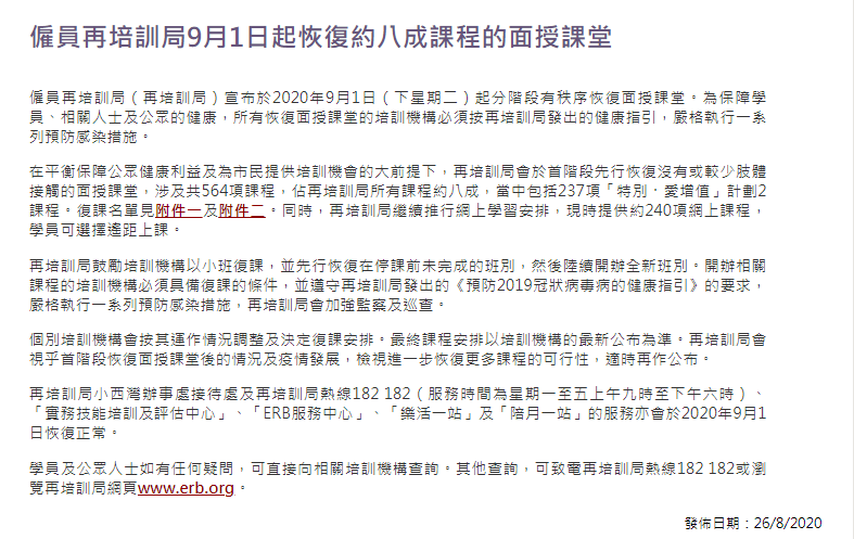 僱員再培訓局今日(26日)宣布,將於今年9月1日(下星期二)起分階段有秩序恢復面授課堂。在平衡保障公眾健康利益及為市民提供培訓機會的大前提下,再培訓局會於首階段先行恢復沒有或較少肢體接觸的面授課堂,涉及共564項課程,佔再培訓局所有課程約八成。同時,再培訓局繼續推行網上學習安排,現時提供約240項網上課程,學員可選擇遙距上課。