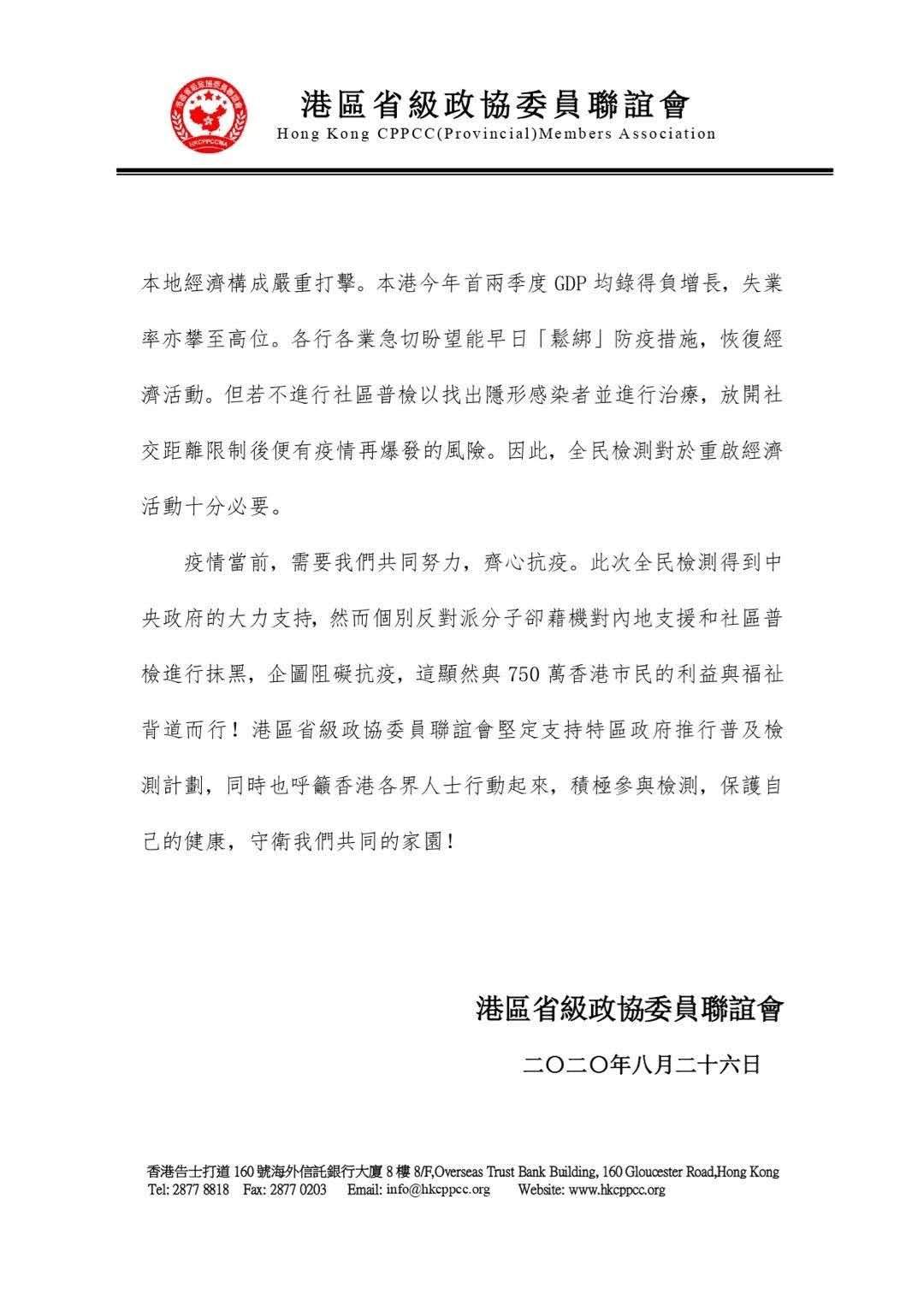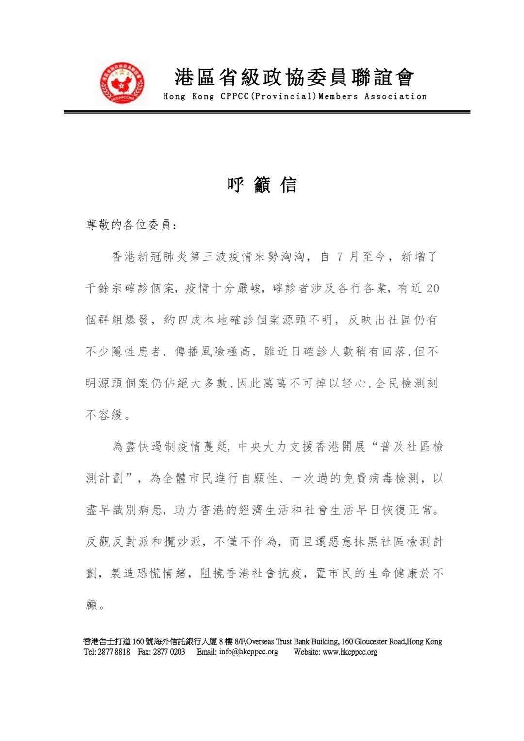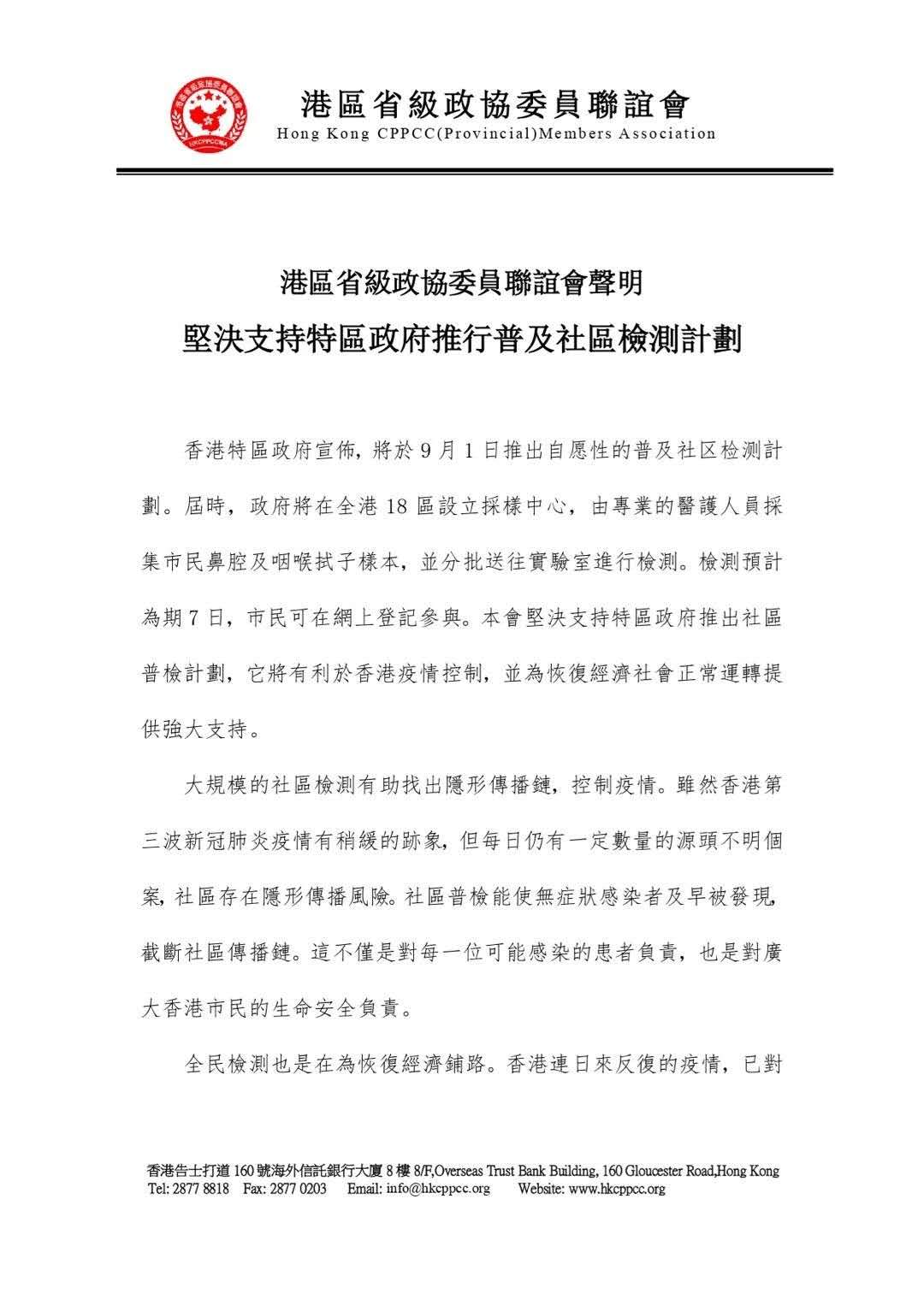 同时,港區省級政協委員聯誼會亦发文呼吁全体委员动员家人、朋友及员工积极参与检测;并向市民宣传检测的必要性和安全性,帮助市民消除疑虑和误解。声明强调,普及社区检测計劃刻不容缓,希望大家积极参与及支持,让香港经济及生活重回正轨。