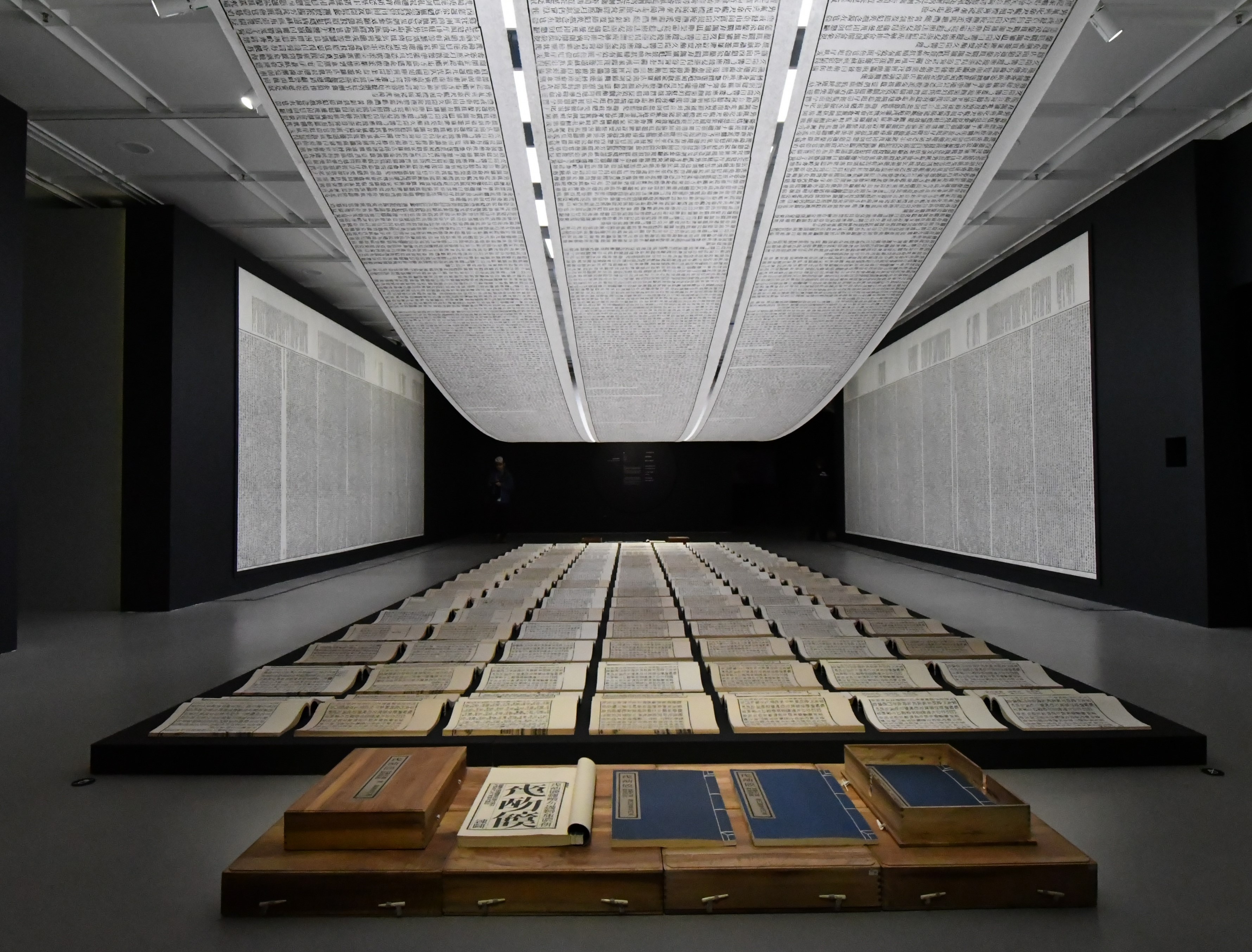 徐冰作品《天書》展於香港藝術館的「小題大作——香港藝術館的故事」展覽中,現場看十分大型,幽暗的環境配合燈光予人震撼感,亦成為不少人打卡必影的作品。透過圖片,難以展現作品的精彩之處。(馮瀚文攝)