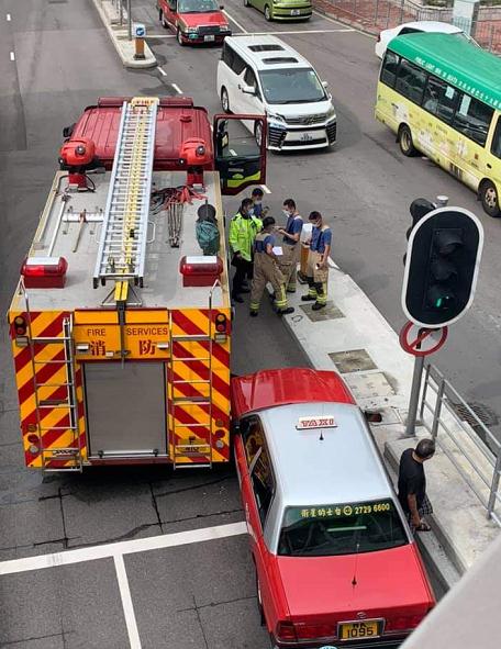 在消防趕往現場途中,1輛消防車在彩虹道轉入大成街時,在交界處與1輛的士相撞,的士車頭撞向消防車的右邊車尾,幸無人受傷,警員接報到場調查。(記者區天海)
