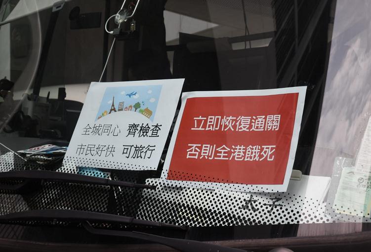 今早數十部旅遊巴由中環摩天輪出發慢駛至政府總部,支持政府推行普及社區檢測。蔡啟文攝