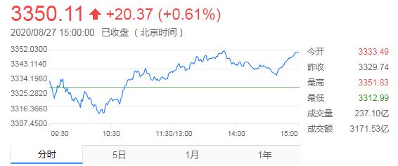 截至收盘,沪指涨0.61%,报3350.11点,深成指涨0.79%,报1353.09点,创业板指涨1.7%,报2689.17点。两市成交额8378.4亿元续创7月以来新低;北向资金净流入超10亿元。