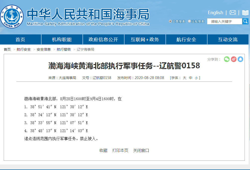據中國海事局官網消息, 中国海事局网站8月28日发布航行警告,渤海海峡黄海北部,8月28日至9月4日,诸点连线範围内执行军事任务,禁止驶入。原文如下,禁航海域如下图所示。