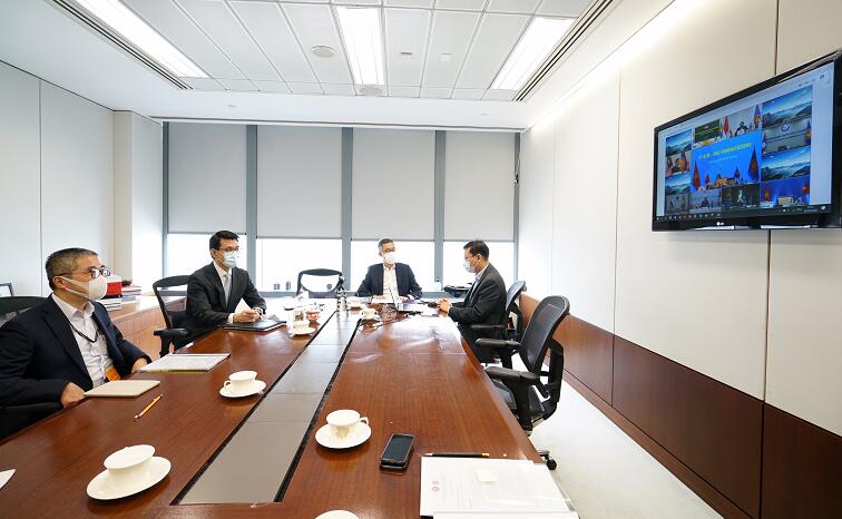 圖为邱騰華(左二)聯同工業貿易署署長盧世雄(左一)出席視像會議。