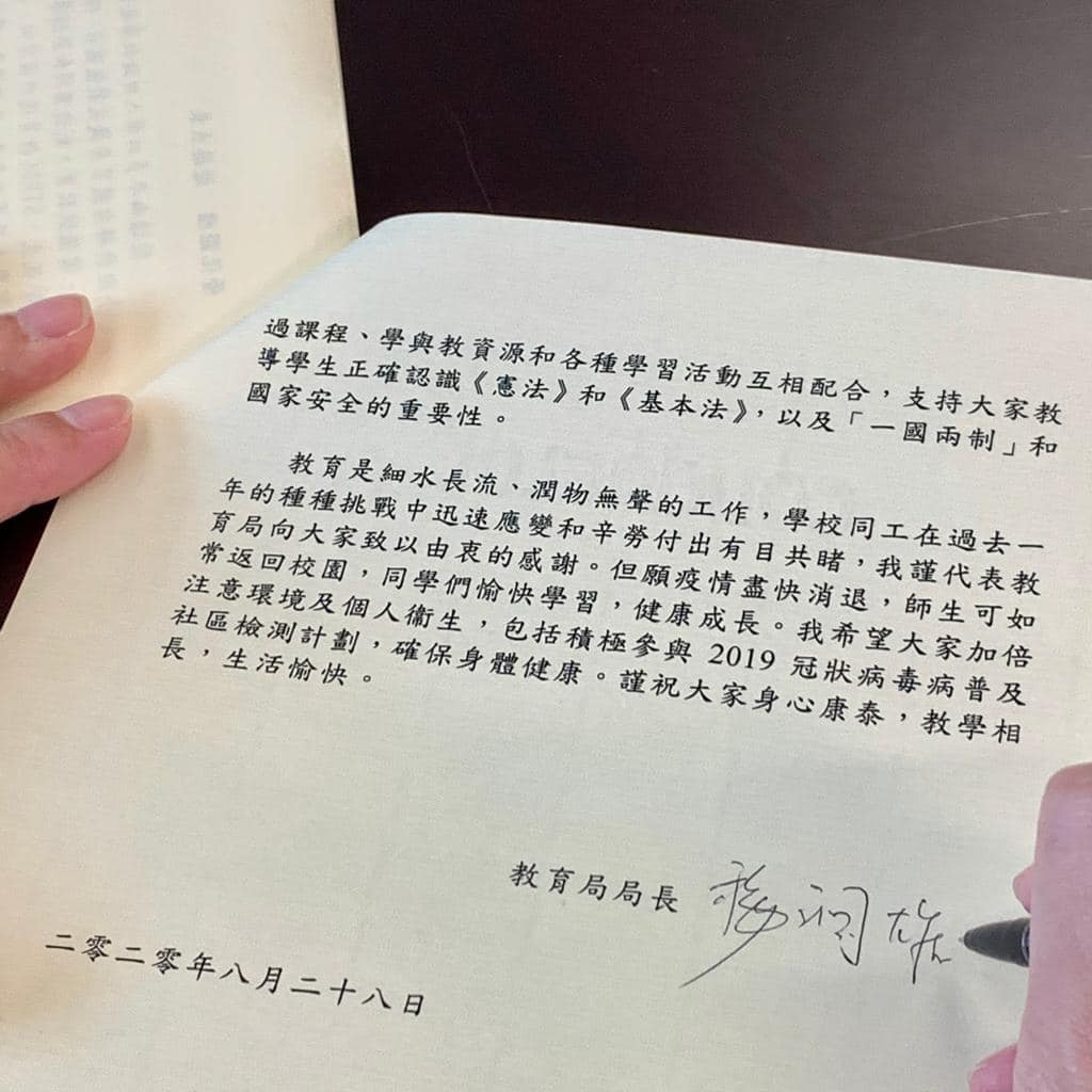 楊潤雄在給中小學校長和老師的信題為《感恩珍惜於今天 知禮守法效前賢》,信中表示校方須幫助學生從小培養國民身份認同和守法意識,在校園遵循校規,在社會遵守法律,成為負責任的良好公民和國民。他又提到教育局早前已發出通告,提示教職員和學生認識、了解及遵守香港國安法。