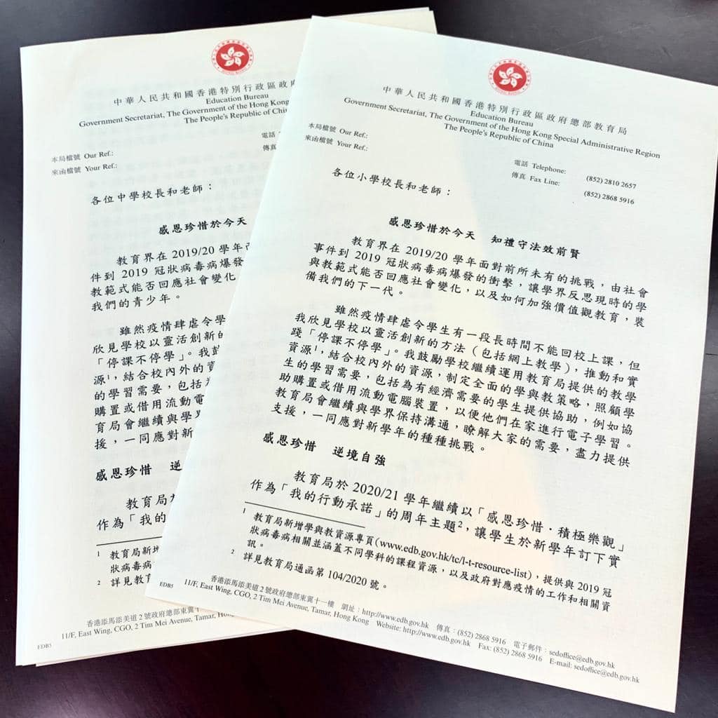 楊潤雄去信全港中小學校長及老師。 圖:楊潤雄 Facebook