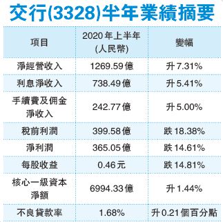 該行上半年股東應佔溢利365.05億元,同比下跌14.61%。每股盈利0.46元,不派息。利息淨收入738.49億元,同比上升5.41%。(記者姚一鶴)