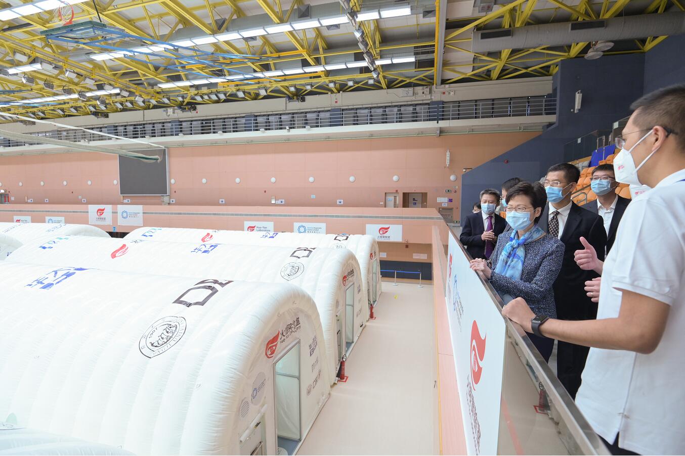 林鄭一行之後視察臨時氣膜實驗室,了解其設備、檢測程序和運作流程。中山紀念公園體育館內共有16個實驗室,是華大基因在港的合資公司華昇診斷中心配合支援隊設置和負責運作。林鄭欣悉經過約兩星期的籌備,實驗室已準備就緒,足以應付大規模檢測。