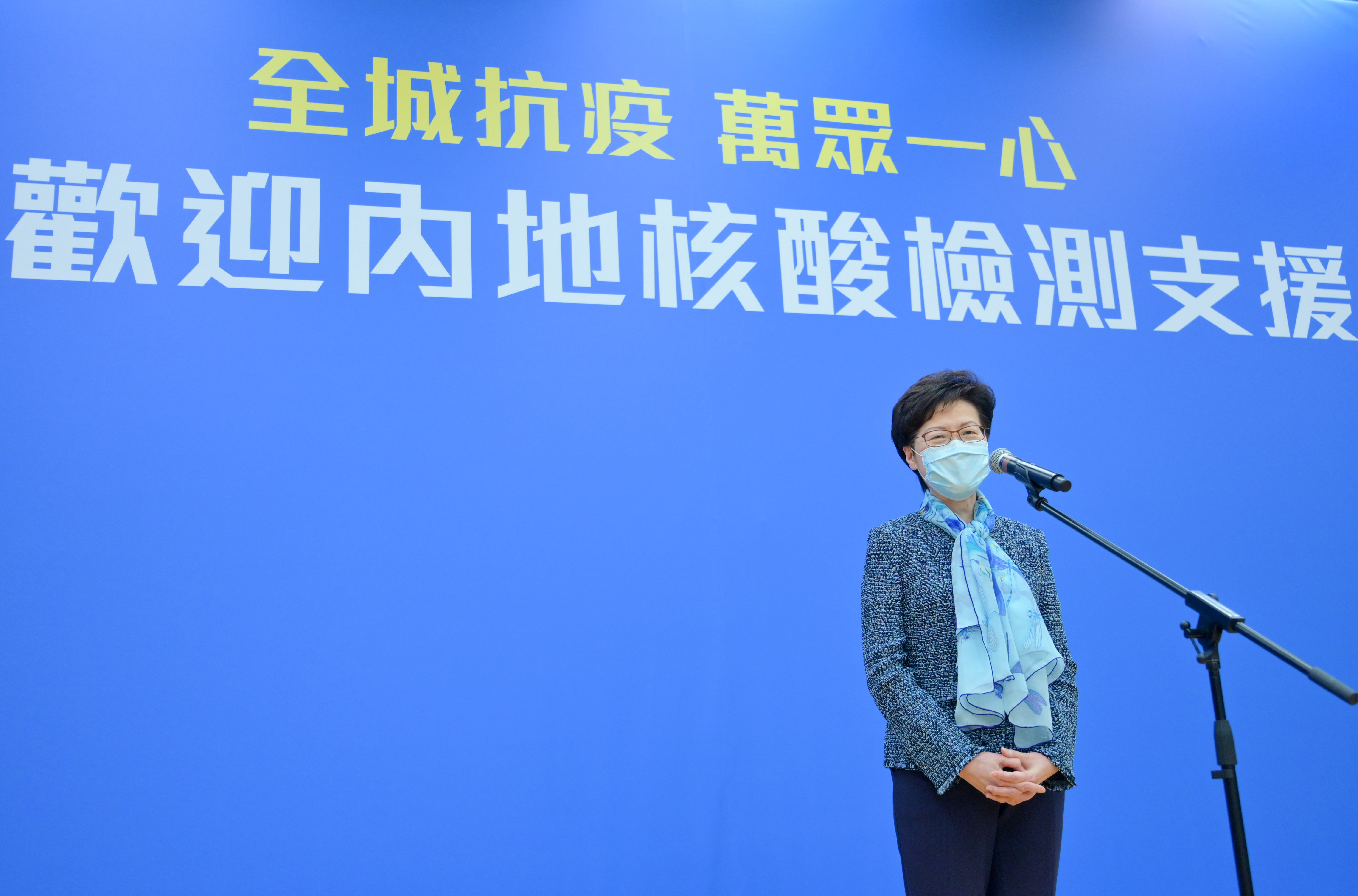 28日,林鄭在中山紀念公園體育館出席歡迎內地核酸檢測支援隊抵港的儀式。她表示衷心感謝中央政府積極回應特區的要求,迅速組成支援隊伍和提供所需設備和資源,短時間內大幅提升香港的檢測能力,讓特區政府可以推出大規模的普及社區檢測計劃,為市民提供「願檢盡檢」的檢測服務。她代表全體香港市民向每一位支援隊成員致謝。