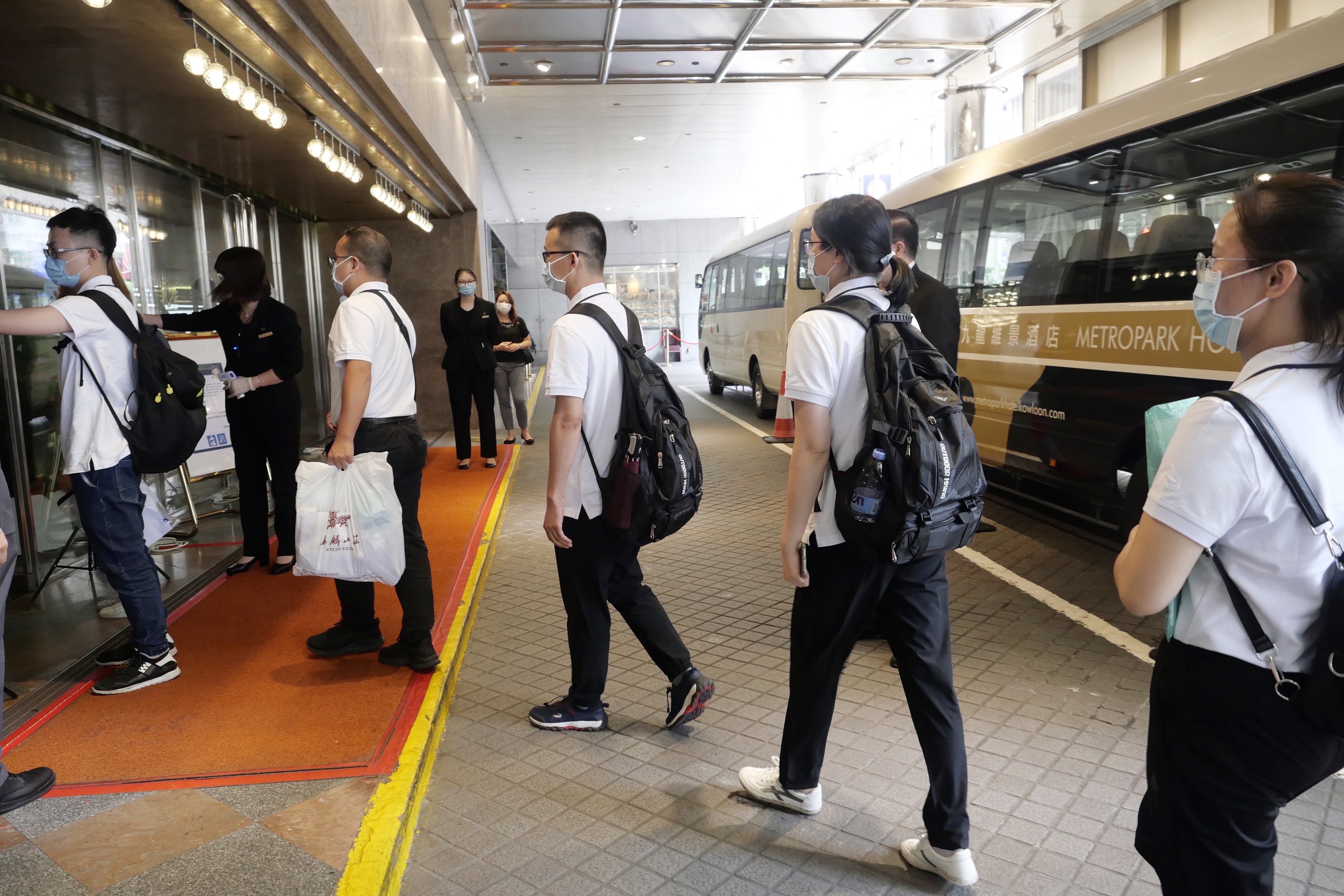 8月28日,内地核酸检测支持队队员抵达香港九龙维景酒店。新华社