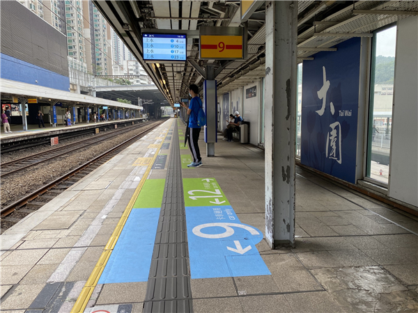 月台設有顯眼的藍、綠色標誌提醒乘客候車位置。
