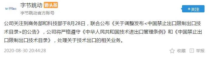 字节跳动微头条刚刚发布声明称,公司关注到商务部和科技部于8月28日,联合公布《关于调整发布<中国禁止出口限制出口技术目录>的公告》,公司将严格遵守《中华人民共和国技术进出口管理条例》和《中国禁止出口限制出口技术目录》,处理关于技术出口的相关业务。