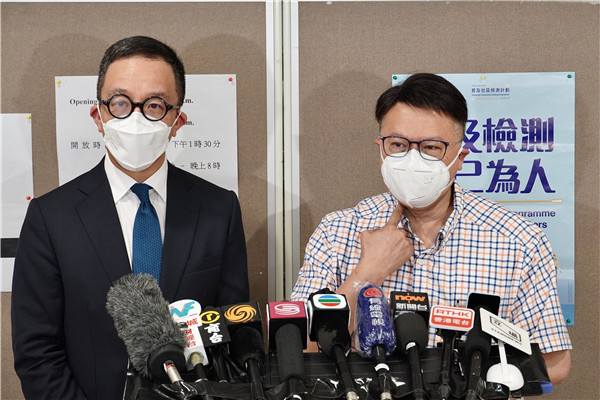 香港大學李嘉誠醫學院院長梁卓偉及香港中文大學內科及藥物治療學系系主任許樹昌昨日到源禾路體育館視察檢測中心接受媒體訪問。馮俊文攝