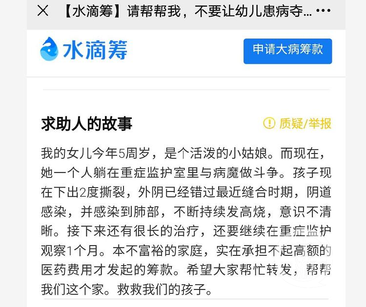 8月31日晚,一则为女儿治病筹款的求助信息在网上流传,求助信息显示:“我的女儿今年5岁,是个活泼的小姑娘,现在她却躺在重症监护室与病魔作斗争,孩子下体出现撕裂,已经错过最近缝合时期……”
