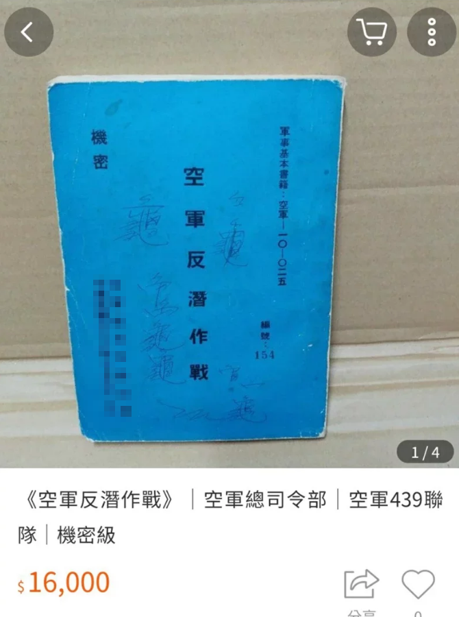 报道表示,一位台湾民众在浏览拍卖商品时,无意中看到有人发的照片,是一本台空军反潜作战资料,封面写「机密」。该民众表示,资料有编号,应是机密列管资料,就算时间久远,也应该保密列管或销毁,而非在网络售卖。