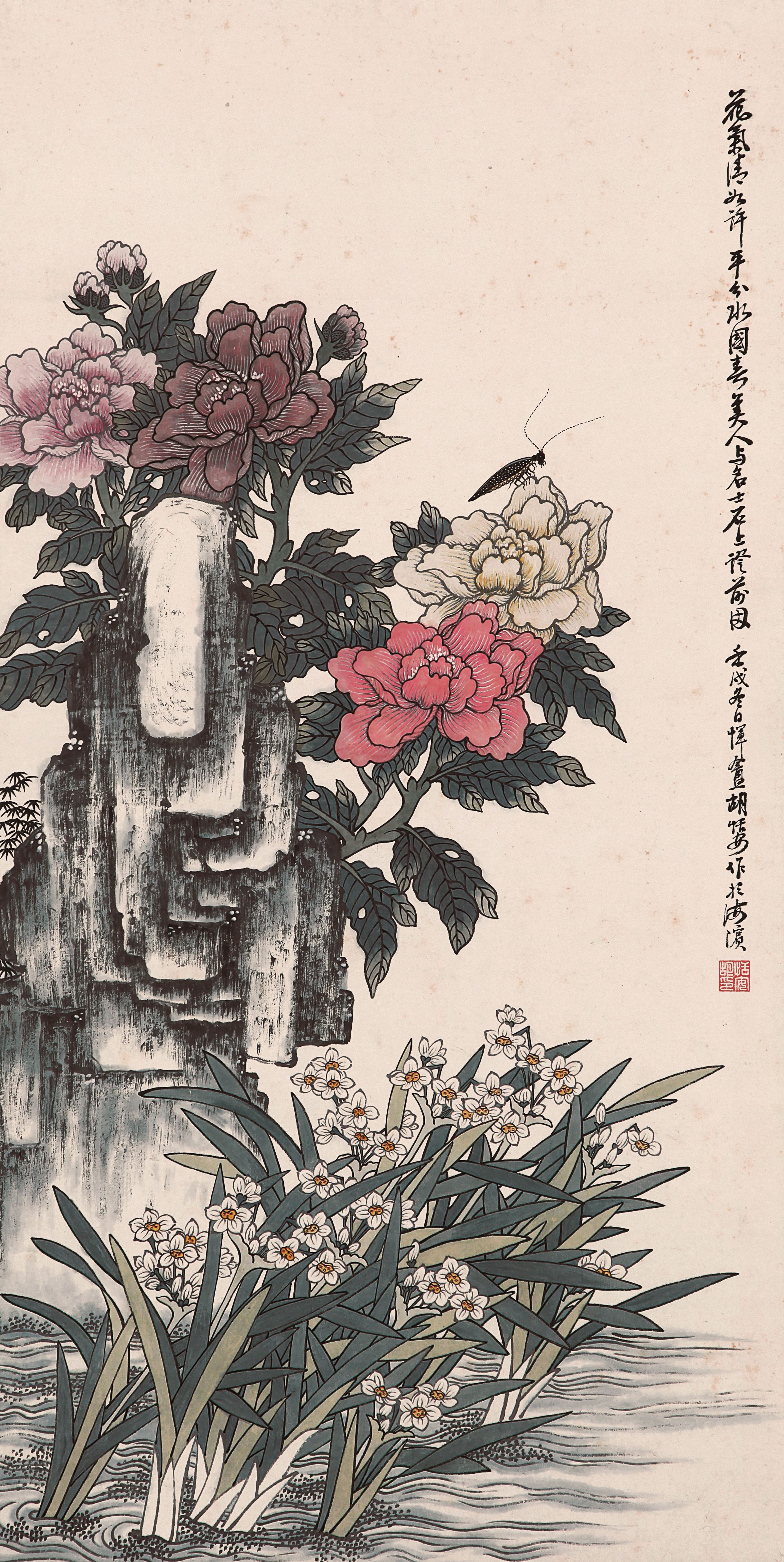 胡恬安,清代畫家。此幅《清雅富貴圖》溫潤秀美、鬱茂勁峭,線條粗細合宜,在不經意中見奇趣,有爽潔明白之韻。生機勃發的牡丹和水仙營造出喜慶祥和的氛圍,二者被頑石分開,和諧相生,雅俗相映,以俗入雅。設色清淡素雅,華而不濁。牡丹端麗嫵媚,水仙清新秀雅,山石渾厚,碧水微瀾,動靜相宜、剛柔並濟,富有節奏。此作看似隨意而作,實際是獨具匠心,處處不離法度。