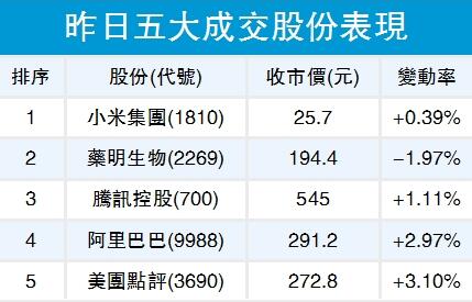 新經濟股輪流破頂,阿里巴巴(9988)、京東(9618)、美團(3690)及小米(1810),全日分別升3%、7.4%、3.1%和0.4%;騰訊(700)則升1.1%。圓通速遞國際(6123)母企圓通速遞獲阿里增持66億元人民幣,收市爆升2.6倍,成為升幅最大港股,成交激增至23.13億元。
