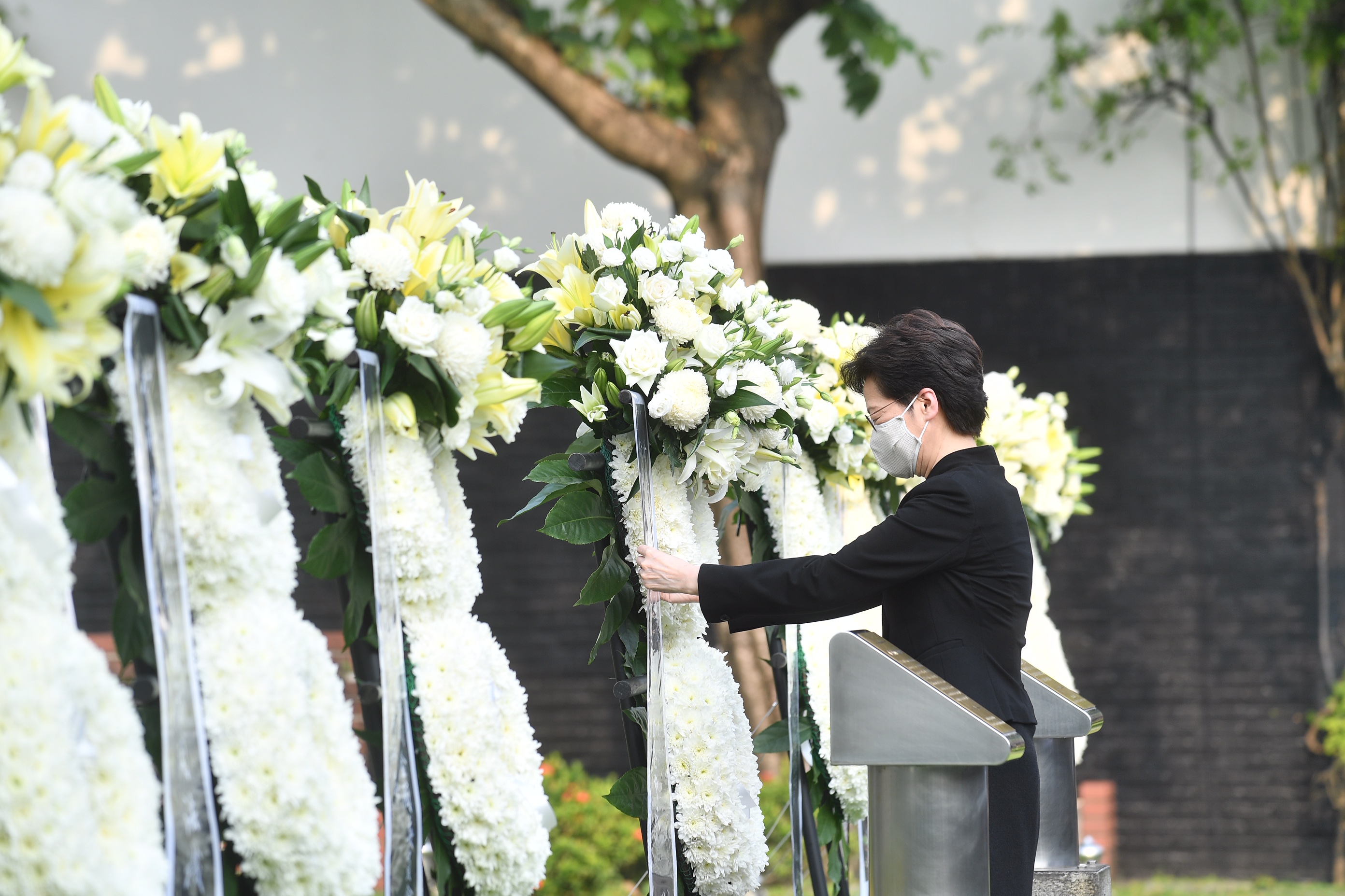 林鄭9月3日上午在中環大會堂紀念花園出席中國人民抗日戰爭勝利紀念日儀式。