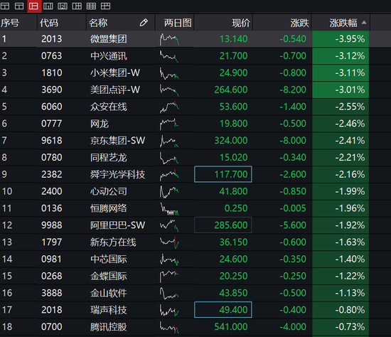 据新浪财经报道,恒生科技股高位回撤集体大跌。其中,微盟跌3.95%,中兴通讯(21.65, -0.75, -3.35%)、小米集团、美团点评集体跌超3%,京东集团、阿里巴巴跌2%,腾讯跌0.7%。