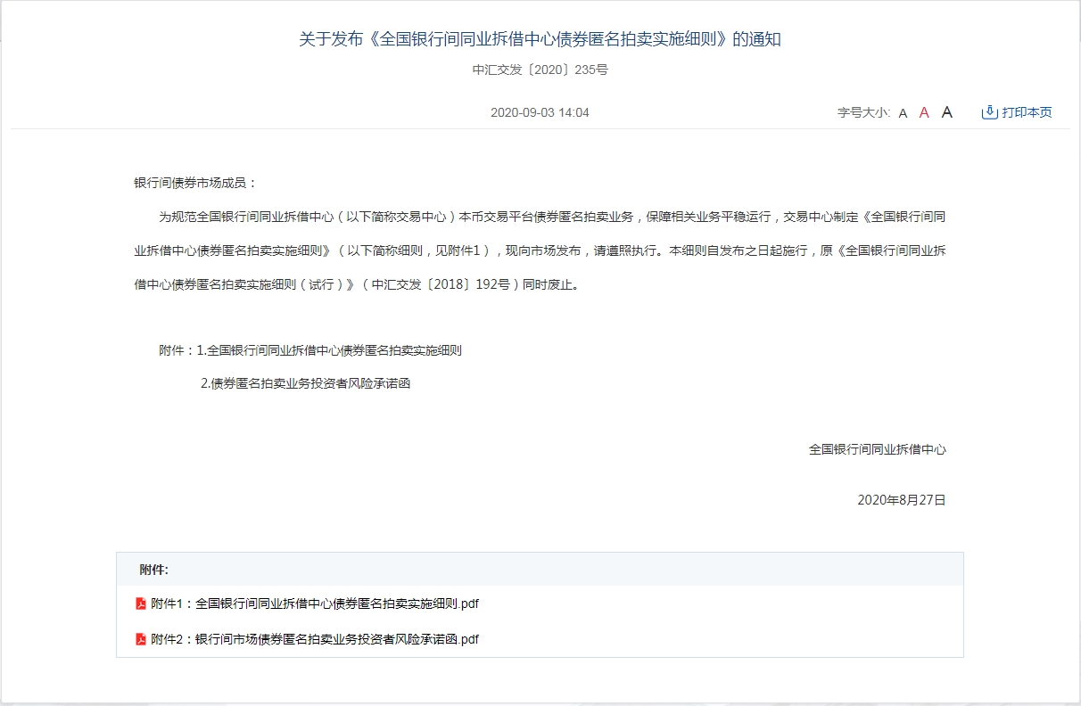 中国外汇交易中心发布《全国银行间同业拆借中心债券匿名拍卖实施细则》的通知。