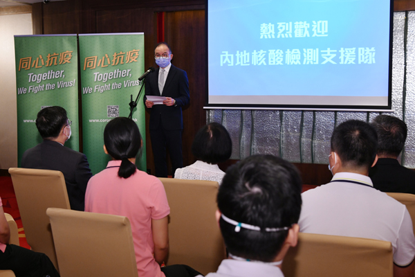 政制及內地事務局局長曾國衛和食物及衞生局局長陳肇始教授今日(九月三日)代表特區政府歡迎內地核酸檢測支援隊成員抵港。圖示曾國衛致歡迎辭。