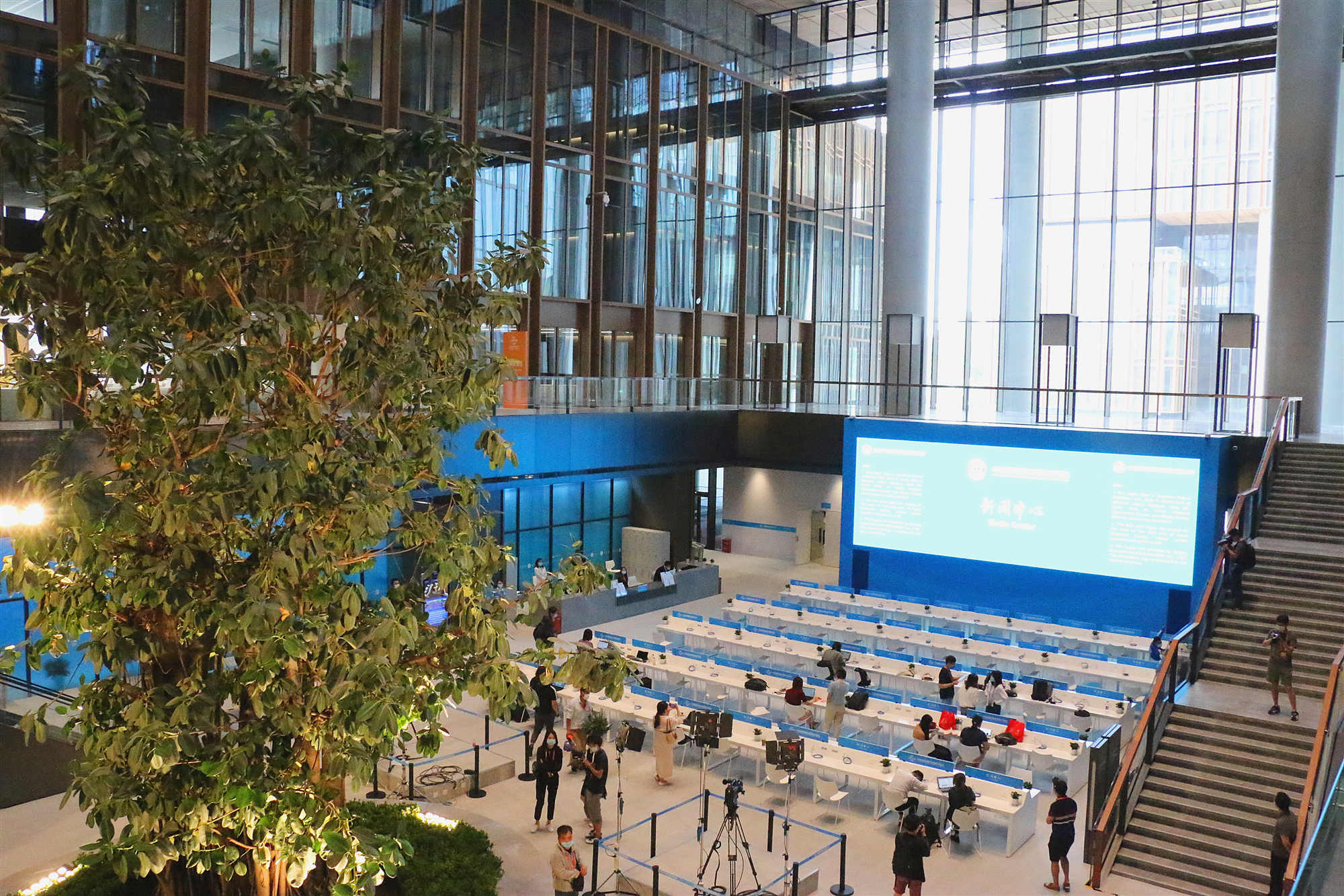 一株高達10餘米的印度膠榕矗立在新聞中心中庭,為記者們帶來愜意的深處園林之中的工作感受