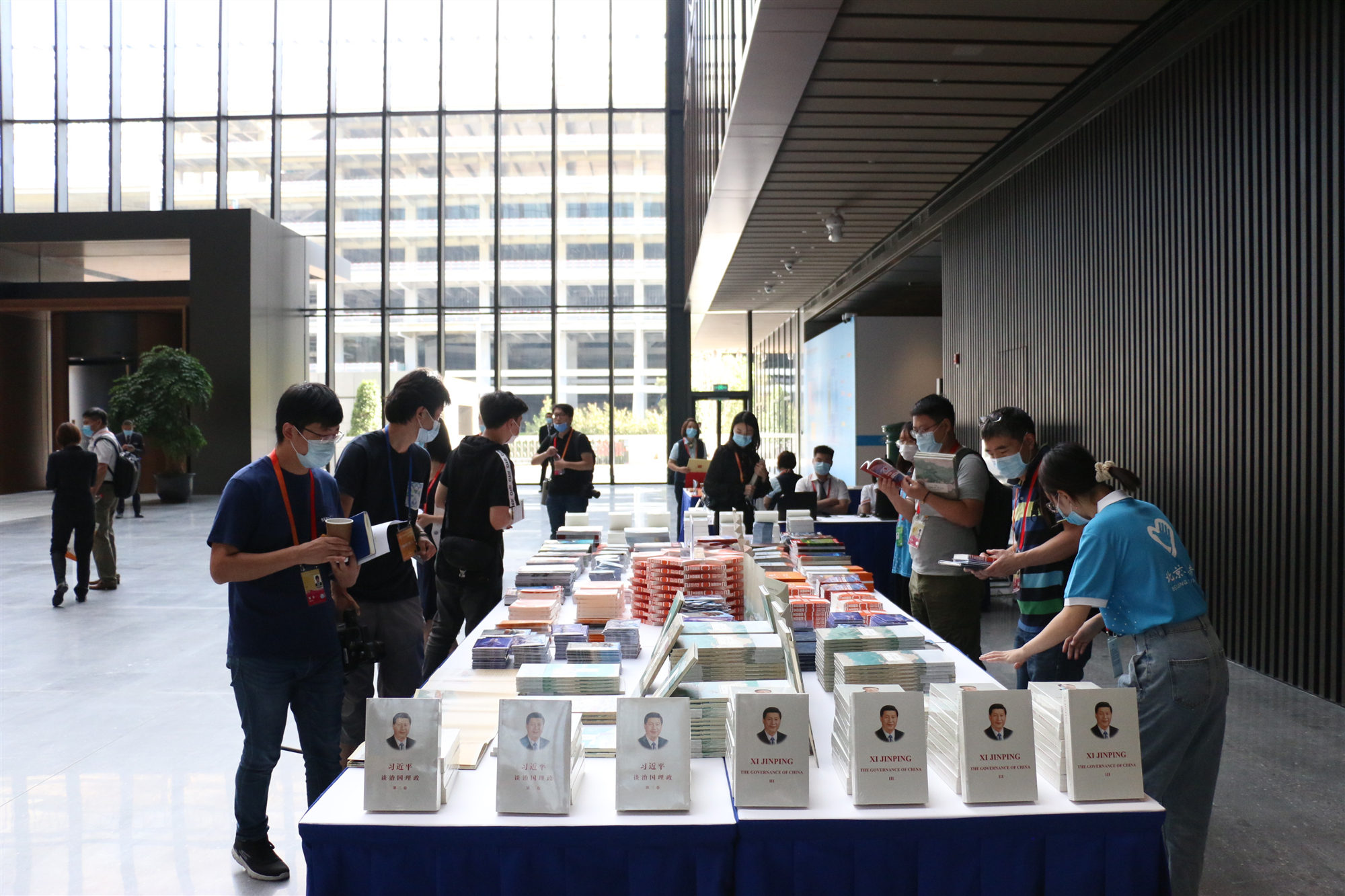 在新聞中心,記者看到組委會給記者擺放了圖書、畫冊、筆記本、明信片等豐富的外宣品。其中有最新出版的《習近平治國理政》(第三卷),近幾年在北京舉辦重大國際外交活動中,《習近平治國理政》均受到境外記者的廣泛青睞。