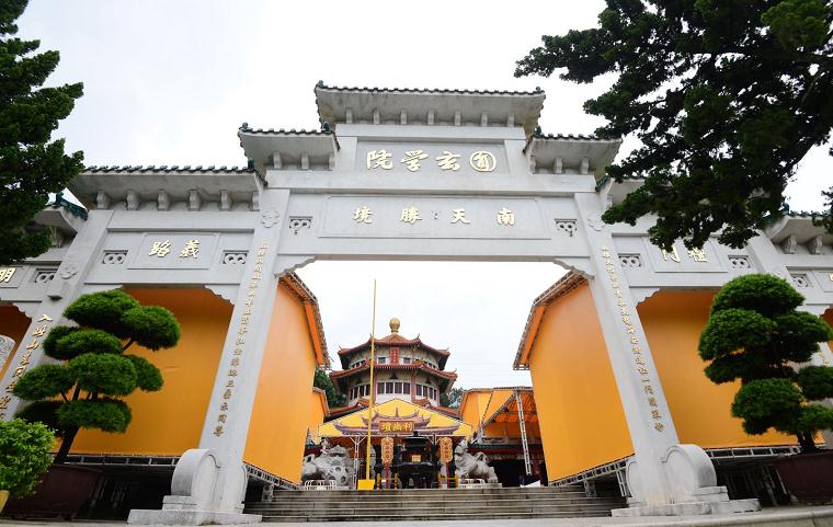本港疫情改善,但限聚令未除,重開多時寺廟未見往日香火鼎盛現象。在荃灣圓玄學院內,嚴格實施量體溫、善信戴口罩防疫措施,今天只見少量善信入內參拜,工作人員續在園內淨心修身服務。(崔俊良攝)