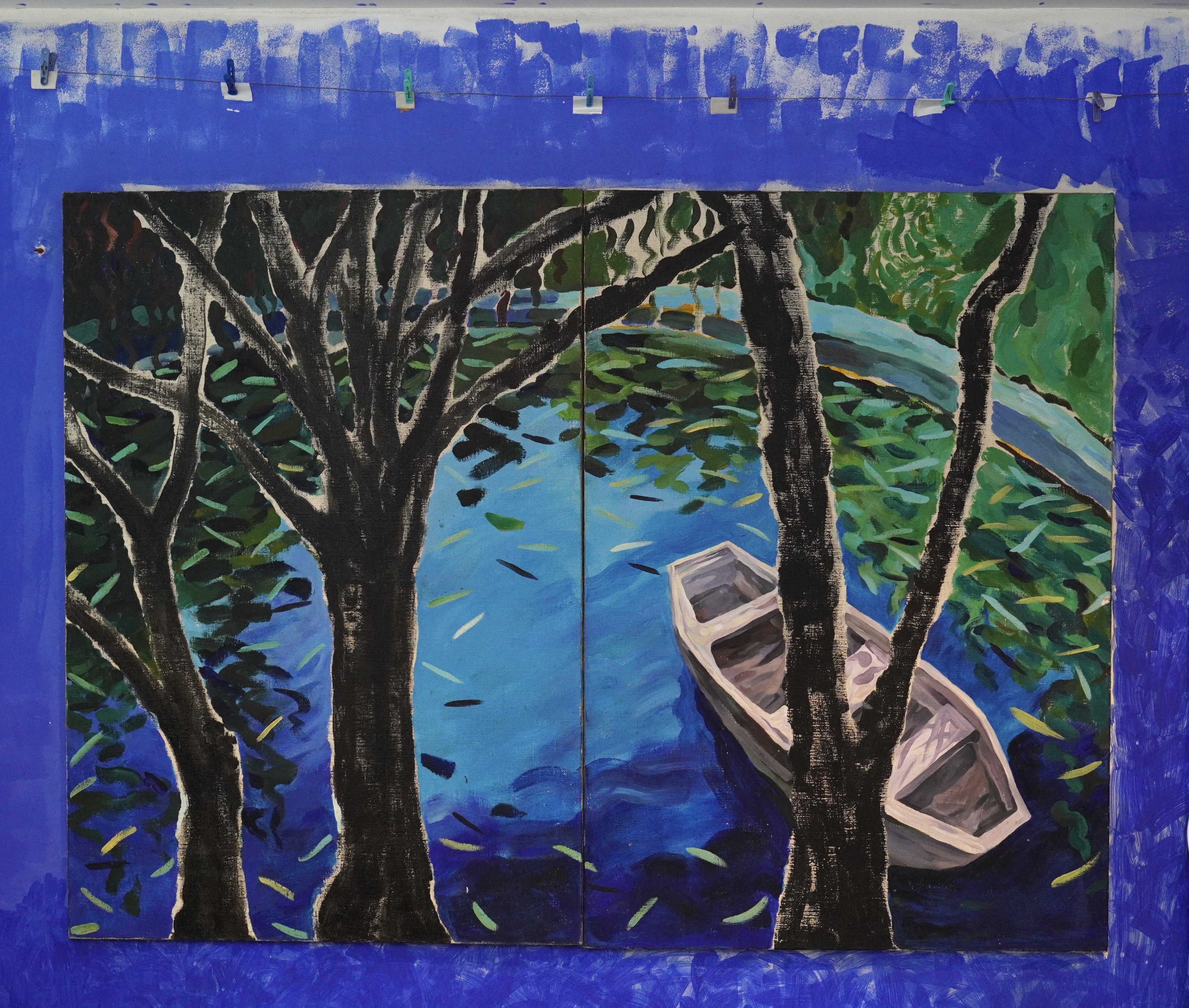 廖東梅及姐姐廖井梅共同創作的畫掛於家中客廳。