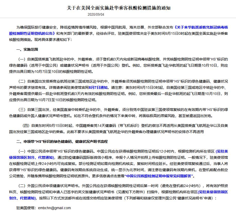 据中国驻美国大使馆网站9月4日消息,为确保国际旅行健康安全,降低疫情跨境传播风险,根据中国民航局、海关总署、外交部联合发布《关于来华航班乘客凭新冠病毒核酸检测阴性证明登机的公告》和有关部门的最新要求,经综合评估,驻美国使领馆决定于美东时间9月15日0时起在美国全面实施赴华乘客核酸检测措施。