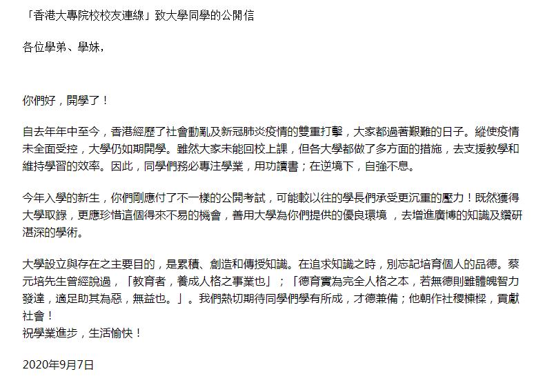 香港大專院校陸續開學,暫未能開放面授課程。「香港大專院校校友連線」今日(7日)發表致大學同學的公開信,勉勵同學們專注學業,用功讀書;在逆境下,自強不息。
