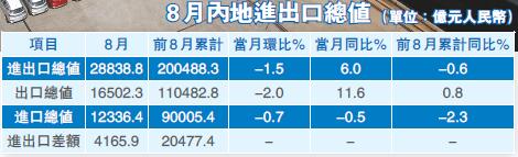 8月進口仍然為負,對此連平認為,進口仍然為負,最大的原因是進口的初級產品價格一直保持在很低的水平,包括原油和貴金屬。可以看到,雖然進口的金額是下降的,但事實上數量上是增加的。這麼來看,8月的進口表現其實還可以。