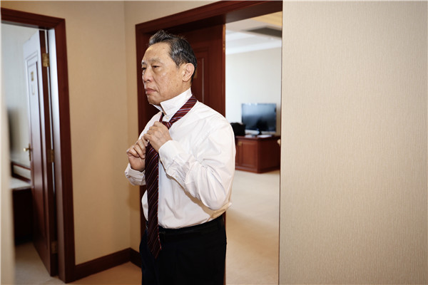 9月8日上午,「共和国勋章」获得者鍾南山在住地整理领带,准备出发。