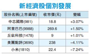 工行(1398)、中行(3988)及建行(939)昨天升3%至4%,是表現最好三隻藍籌,為恒指進帳約110點。新經濟股個別發展,小米(1810)跌逾7%,是最弱勢藍籌,美團點評(3690)曾失守230元關口,收市跌4%。