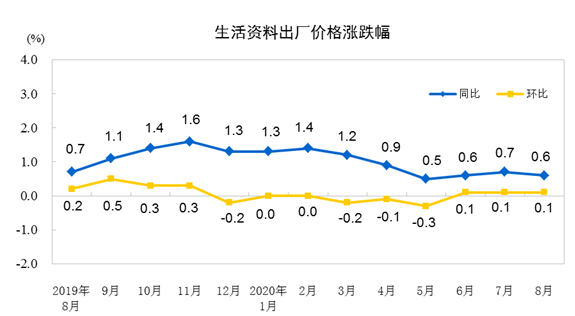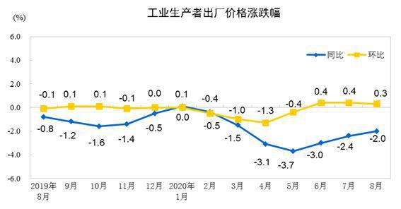 2020年8月份,全國工業生產者出廠價格同比下降2.0%,環比上漲0.3%;工業生產者購進價格同比下降2.5%,環比上漲0.6%。1―8月平均,工業生產者出廠價格比去年同期下降2.0%,工業生產者購進價格下降2.7%。
