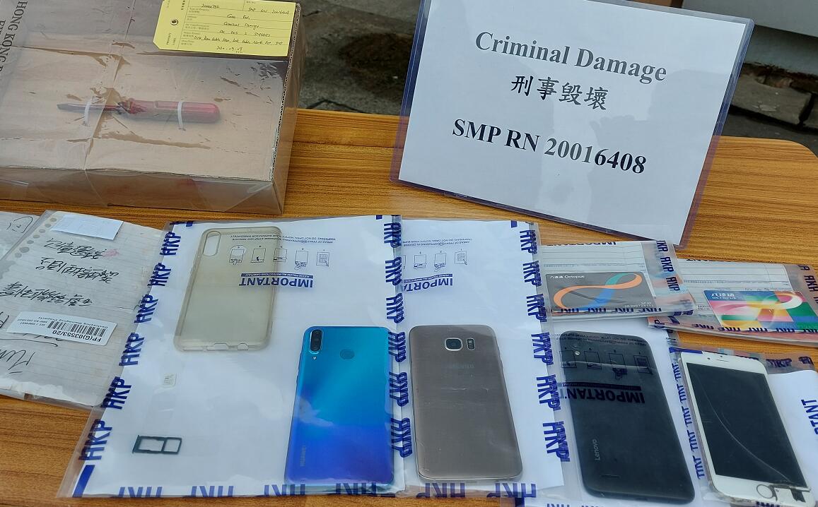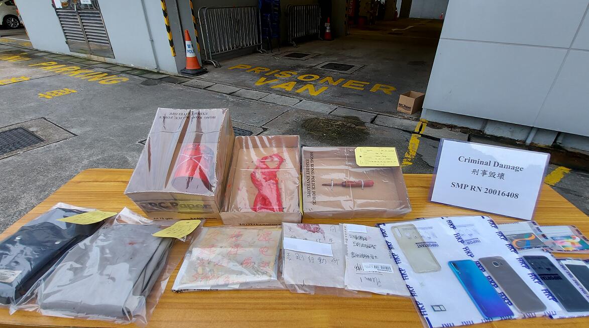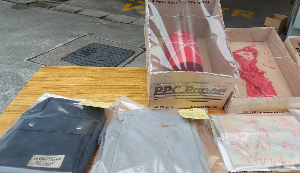 行動中檢獲的證物,包括紅油罐、還款大字報、鑼絲批、疑犯的手機和犯案時所穿衣物