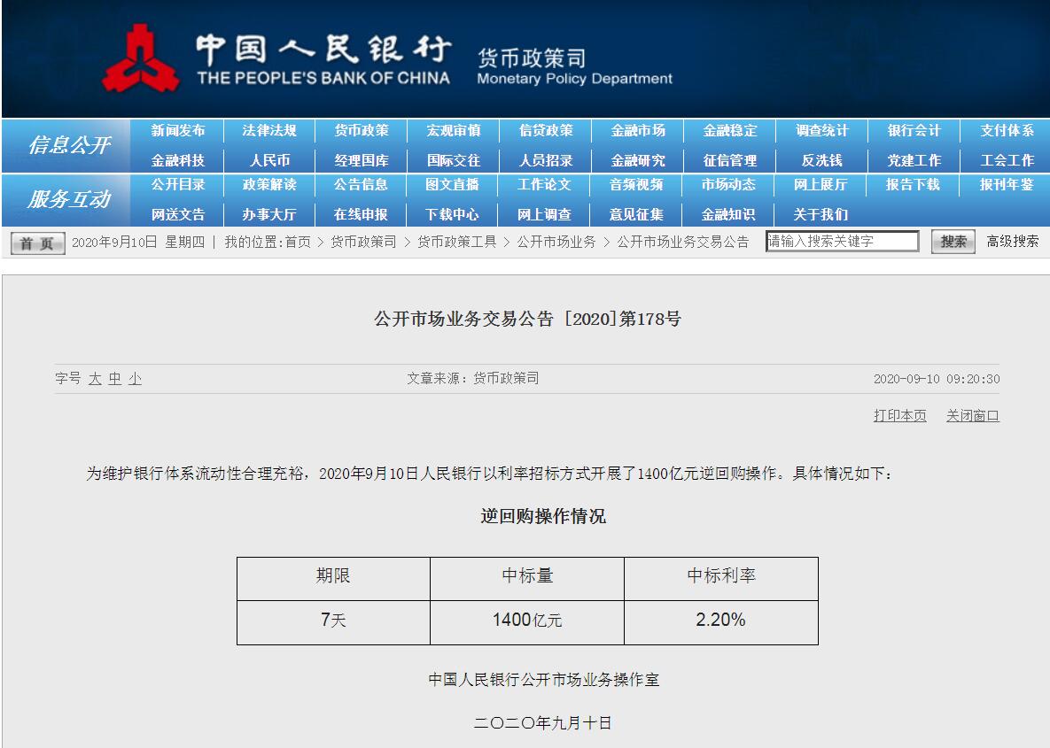 为维护银行体系流动性合理充裕,2020年9月10日人民银行以利率招标方式开展了1400亿元逆回购操作。7天期逆回购操作中标利率2.2%,与此前持平。