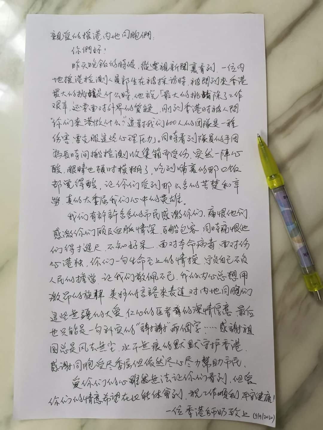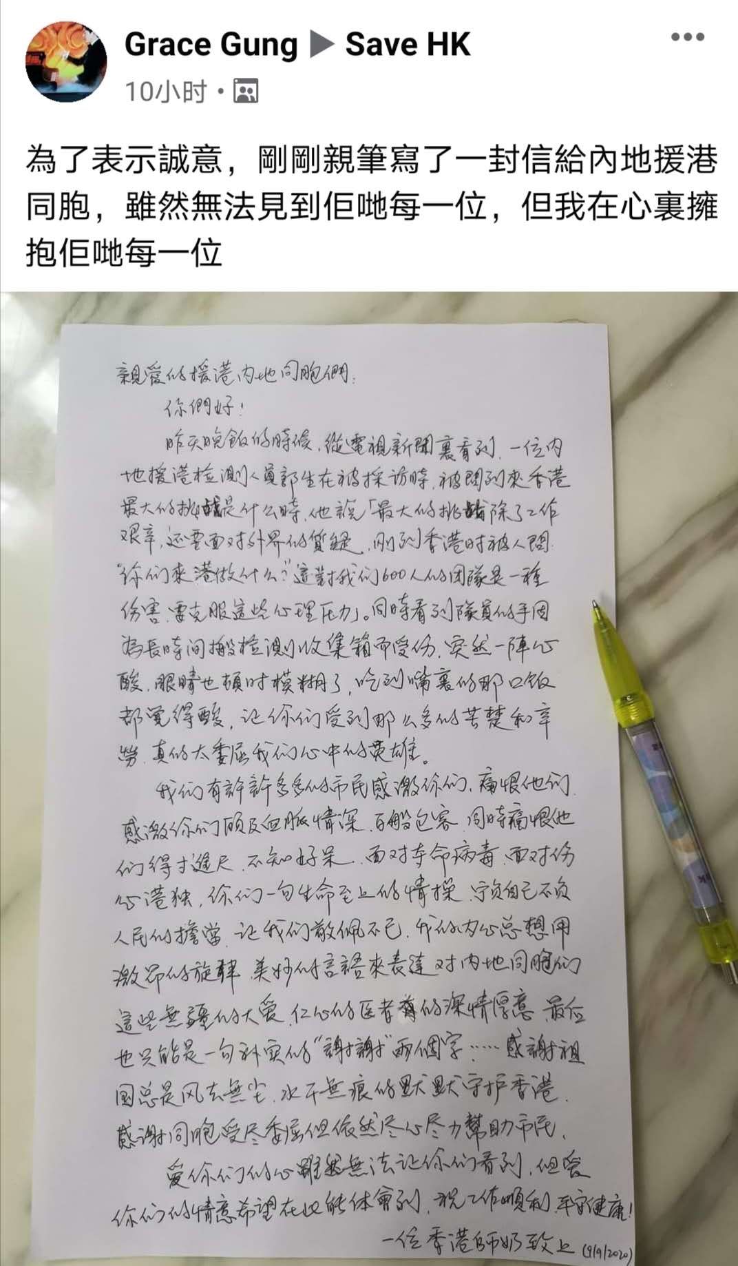 这位师奶在文中写道,为了表示诚意,亲笔写了一封信给内地援港同胞,虽然无法见到他们每一位,但在心裏拥抱他们每一位。