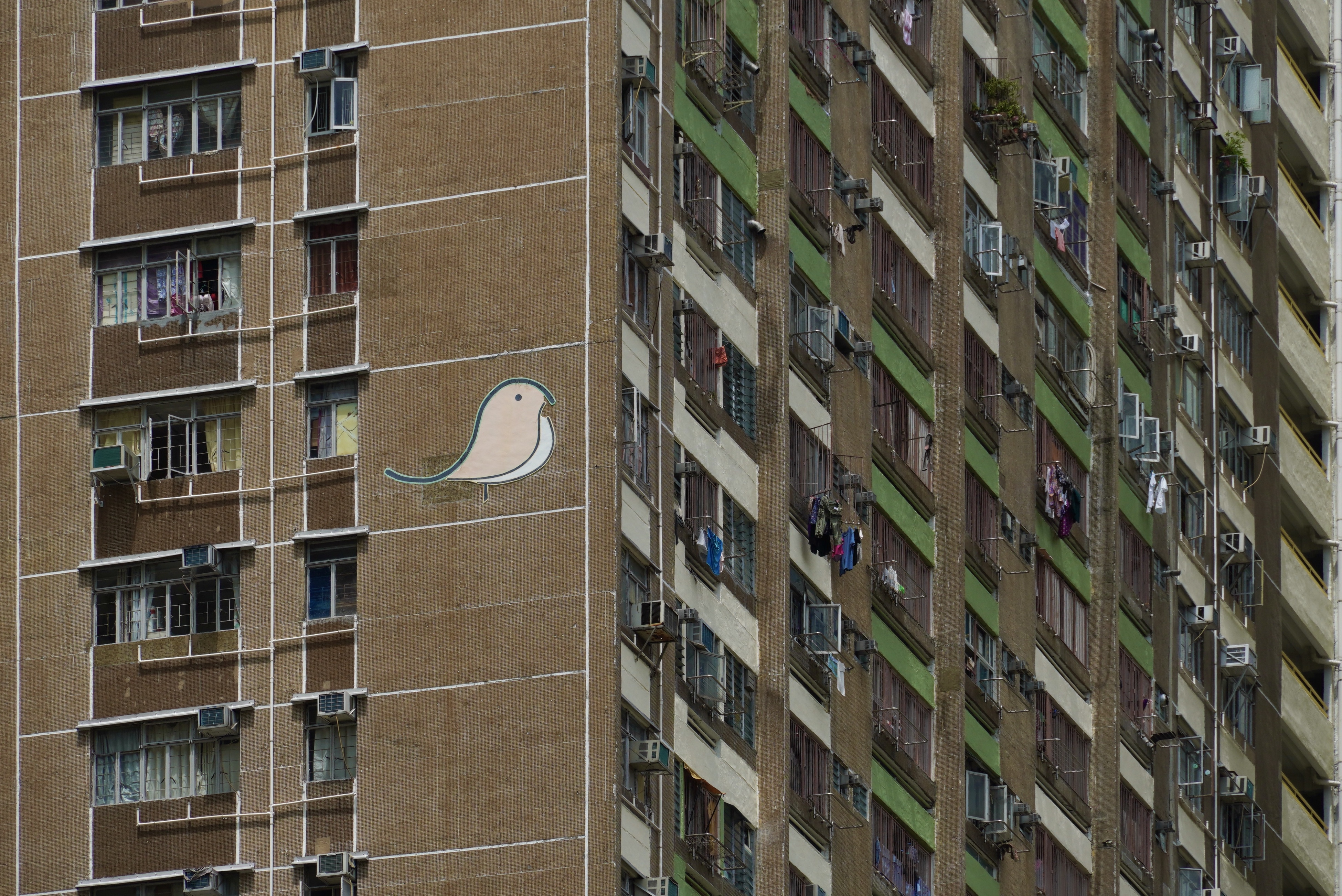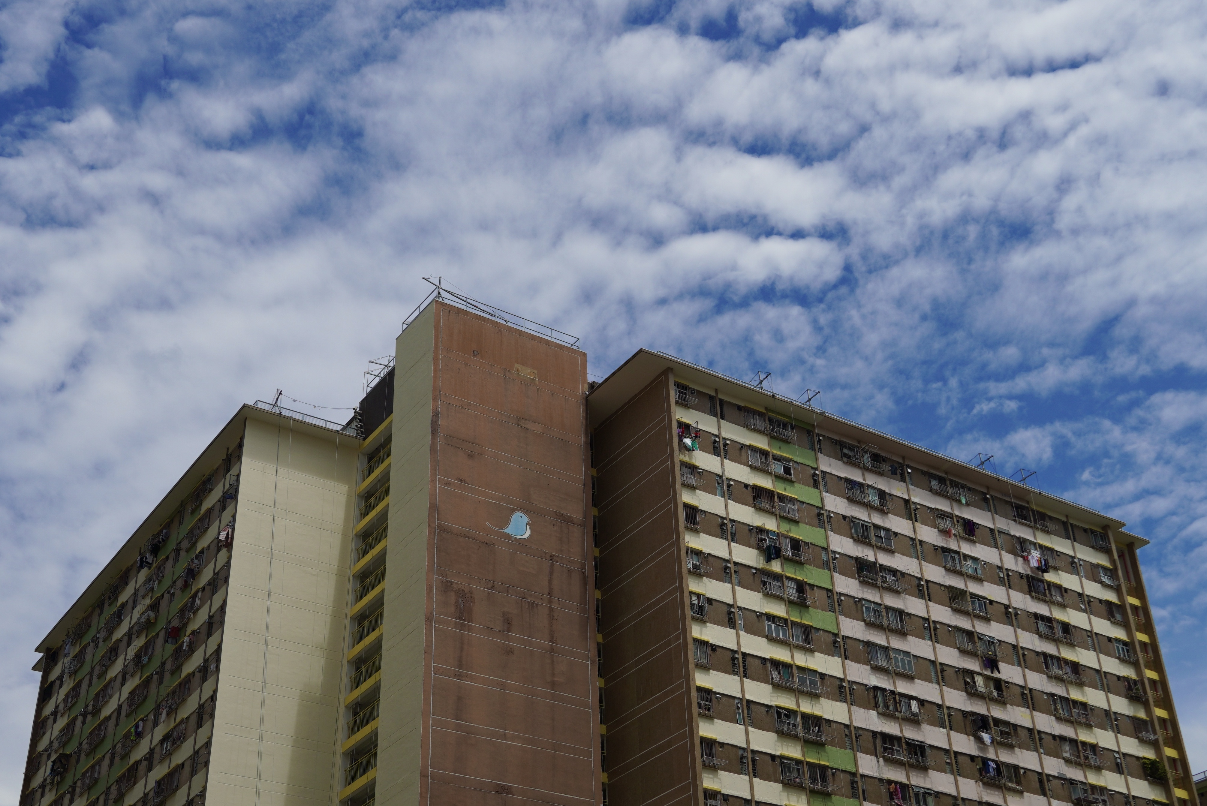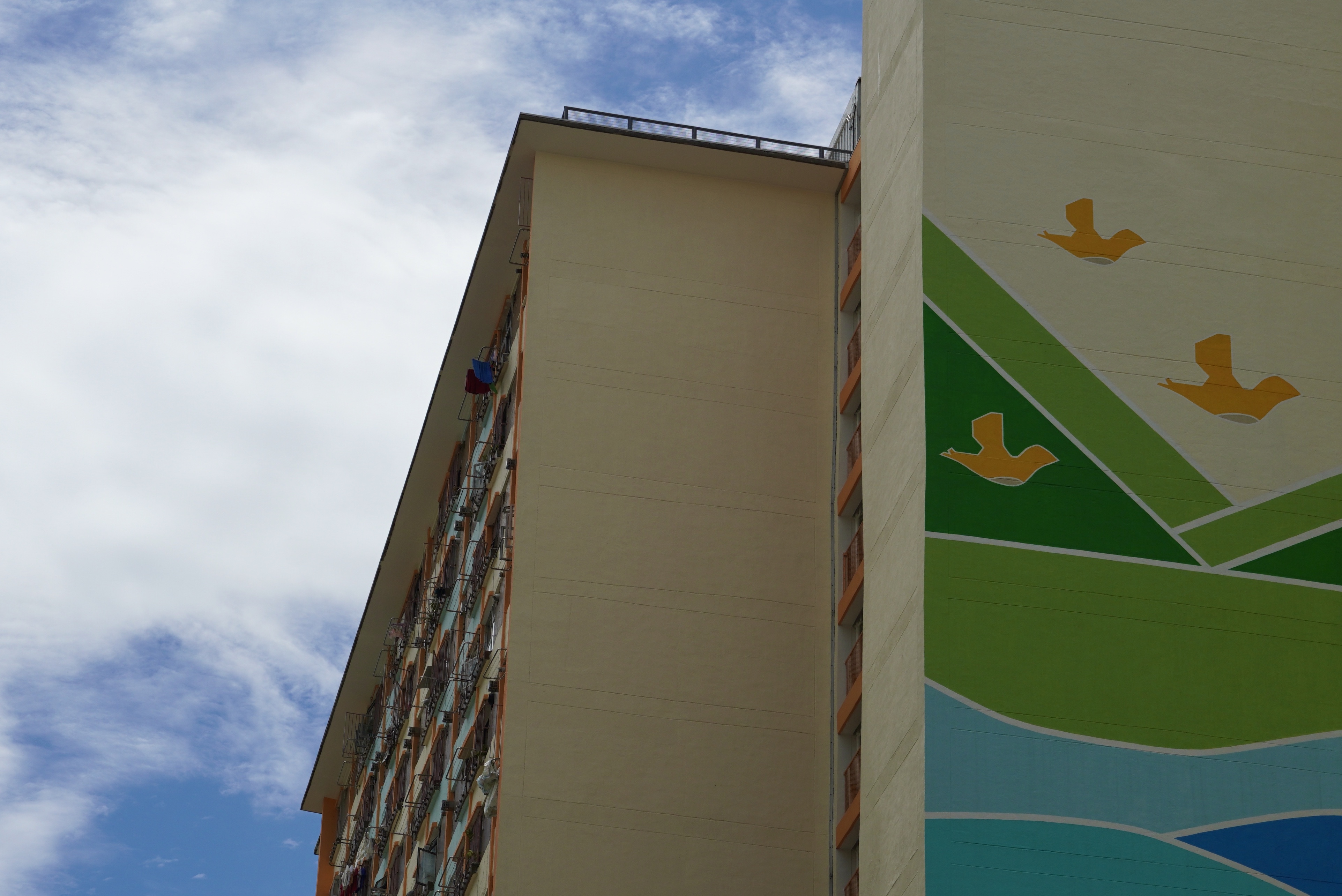 屹立於沙田四十年的沙角邨,邨內七幢大廈均以雀鳥命名。居民遊走在屋村內,只需抬頭一看,便能在平凡的外牆上找到「沙角鳥」的蹤跡。在平淡的日常中,增添一些色彩小樂趣。可惜這些年來,外牆受盡日曬雨淋,一群鮮艷的雀鳥都褪了色。但居民都不會忘記,「沙角鳥」的獨特之處。(记者 馮俊文 攝)
