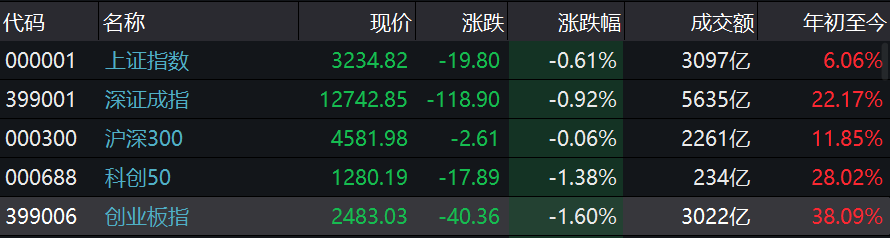 10日,A股出现回调,三大股指集体收跌。早盘高开后即展开震荡下行走势,全天未形成过像样反弹。截至收盘,沪指报3234.82点,跌0.61%;深成指跌报12742.85点,跌幅0.92%;创业板指报2483.03点,跌1.60%。创业板有约50只个股跌停,低价股掀跌停潮。