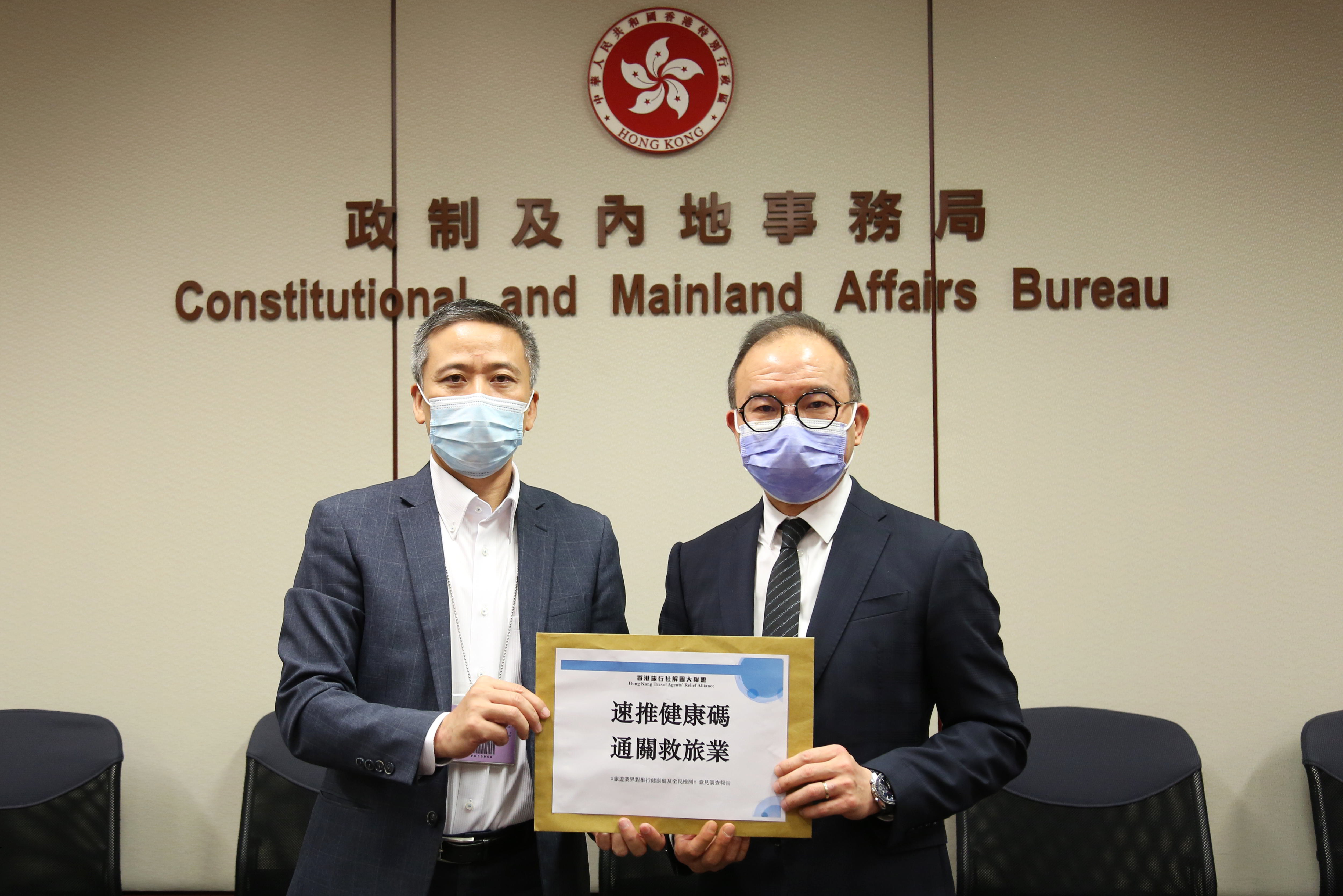 香港旅行社解困大聯盟召集人姚柏良、多名代表和旅遊界立法會議員姚思榮今日(10日)與政制及內地事務局局長曾國衛會面,遞交《旅遊業界對推行健康碼及全民檢測》意見調查報告,並表達盡早推出健康碼及恢復逐步通關的訴求。